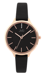 8592818146787Women's watch JVD JZ201.6 with a black dial and zircon in an elegant stainless steel case with IPGold finish. The black leather strap and precise Miyota movement ensure style and reliability for everyday wear with 30M water resistance. More