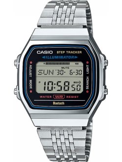 4549526378188Stylish Casio digital watch in a retro design with modern features. Offers Bluetooth connection to your phone, step counter, stopwatch, alarms, and dual time.