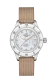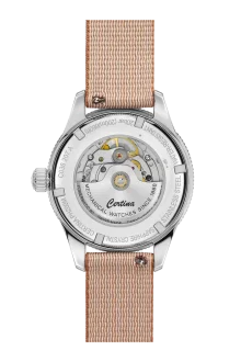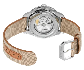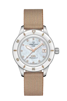 The Certina DS PH200M Powermatic 80 C036.207.18.106.00 is a ladies' automatic watch that combines elegance with an eco-friendly approach. It features a beige textile strap in #tide ocean material, which is made from plastics harvested from the oceans, thus supporting sustainable development. The design of the watch is inspired by the iconic PH200M model from 1967. The stainless steel case, combining a matt and glossy finish, has a diameter of 39 millimetres and a unidirectional rotating lunette with a subtly convex ceramic insert and diving scale. The transparent dial reveals a mother-of-pearl dial with date indication, protected by a sapphire crystal with anti-reflective coating, whose beauty is fully revealed under direct light thanks to the fascinating play of colours. The hour indexes are decorated with 11 diamonds and the hands, together with part of the lunette, are coated with Super-LumiNova® luminescent coating for excellent legibility even in low-light conditions. At the heart of the watch is the Powermatic 80.611 mechanical movement with automatic winding and an impressive power reserve of up to 80 hours. The calibre is equipped with a Nivachron™ antimagnetic thread, which guarantees high resistance to magnetic fields. This machine allows manual winding with a screw-in crown and has a hacking function. DS (Double Security) technology, perfected since 1959, ensures the watch's increased resistance to shock and water.