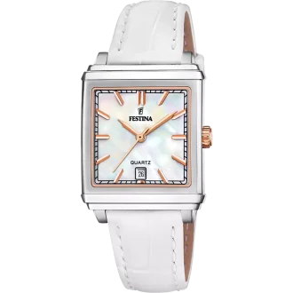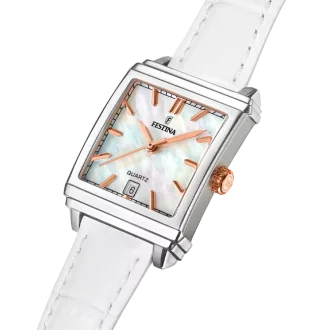 8430622819056Women's dress watch Festina 20682/1 with an elegant square mother-of-pearl dial and a white leather strap. Precise Japanese Miyota movement, 50M water resistance, and a practical date display. A stylish accessory for women who want to shine. More